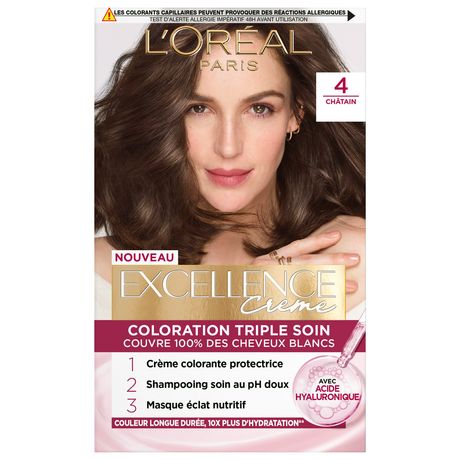 Excellence Crème de L'Oréal Paris, enrichi en acide hyaluronique* pour 10X plus d’hydratation** et une couleur riche longue durée. Obtenez une qualité de cheveux visiblement meilleure que sans coloration. Couvre 100% des cheveux blancs*** pour tous