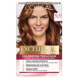 Nouveau Excellence Crème, la coloration qui vous respecte* grâce à son nouveau rituel triple soin. 1) Respecte le cheveu grâce à la crème colorante protectrice. Enrichie en Pro-Kératine et actifs de sérum protecteur qui préservent le cheveu pendant l