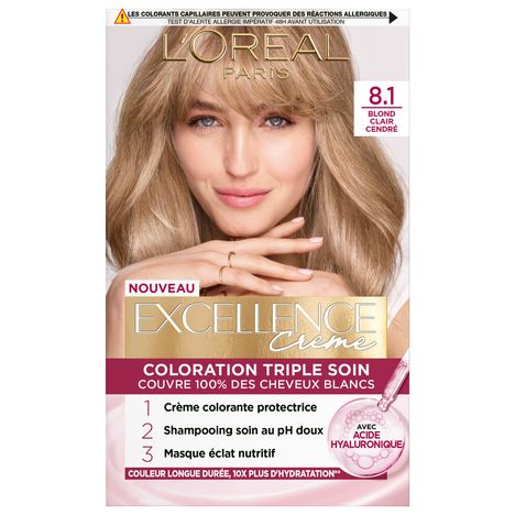 Excellence Crème de L'Oréal Paris, enrichi en acide hyaluronique* pour 10X plus d’hydratation** et une couleur riche longue durée. Obtenez une qualité de cheveux visiblement meilleure que sans coloration. Couvre 100% des cheveux blancs*** pour tous les types de cheveux. *Shampooing et masque enrichis en acide hyaluronique **Test instrumental après utilisation du masque nutritif ***Test instrumental Le Kit contient une crème colorante protectrice, un shampooing soin au pH doux et un masque éclat nutritif. Si vous hésitez entre deux nuances, choisissez la teinte la plus clair. Si vous avez les cheveux longs, utilisez deux kits de coloration. Conseil entre deux colorations, camouflez vos racines avec Magic Retouch. Votre couleur est riche et homogène, vos cheveux souples et brillants.