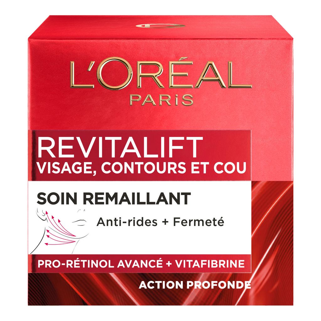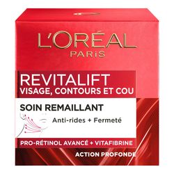 Crème de Jour Anti-Rides Spéciale Visage, Contours et Cou enrichie en Vitafibrine et au Pro-Rétinol Avancé. Dès l'application : hydratation et confort immédiats Jour après jour: peau plus ferme, comme remaillée. Rides du cou visiblement réduites. En 4 semaines : contours du visage redéfinis (71%), peau paraît plus tendue, comme liftée (76%), peau du cou plus ferme (71%) Autres produits de la gamme proposés pour compléter le soin.