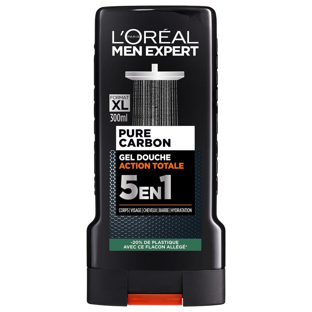 Le 1er gel Douche enrichi en [Carbone] pour 5 actions (corps, visage, cheveux, rasage, hydratation] en un seul geste.