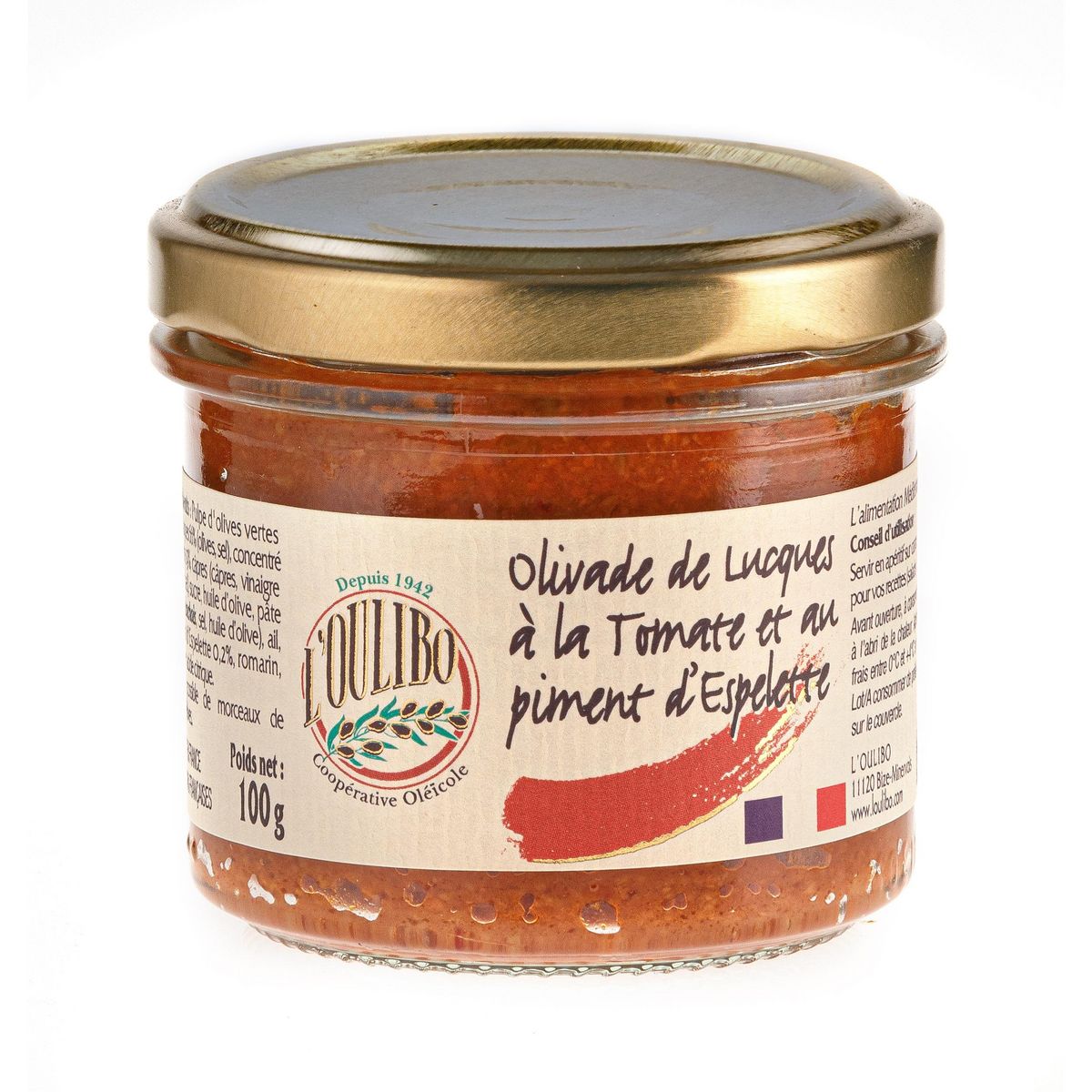Pulpe d'olives vertes variété Lucques 66% (olives, sel), concentré de tomate 29%, câpres (câpres, vinaigre d'alcool, sel), sucre, huile d'olive, pâte d'anchois (anchois, sel, huile d'olive), ail, sel, piment d'Espelette 0,2%, romarin, acidifiant : acide citrique.