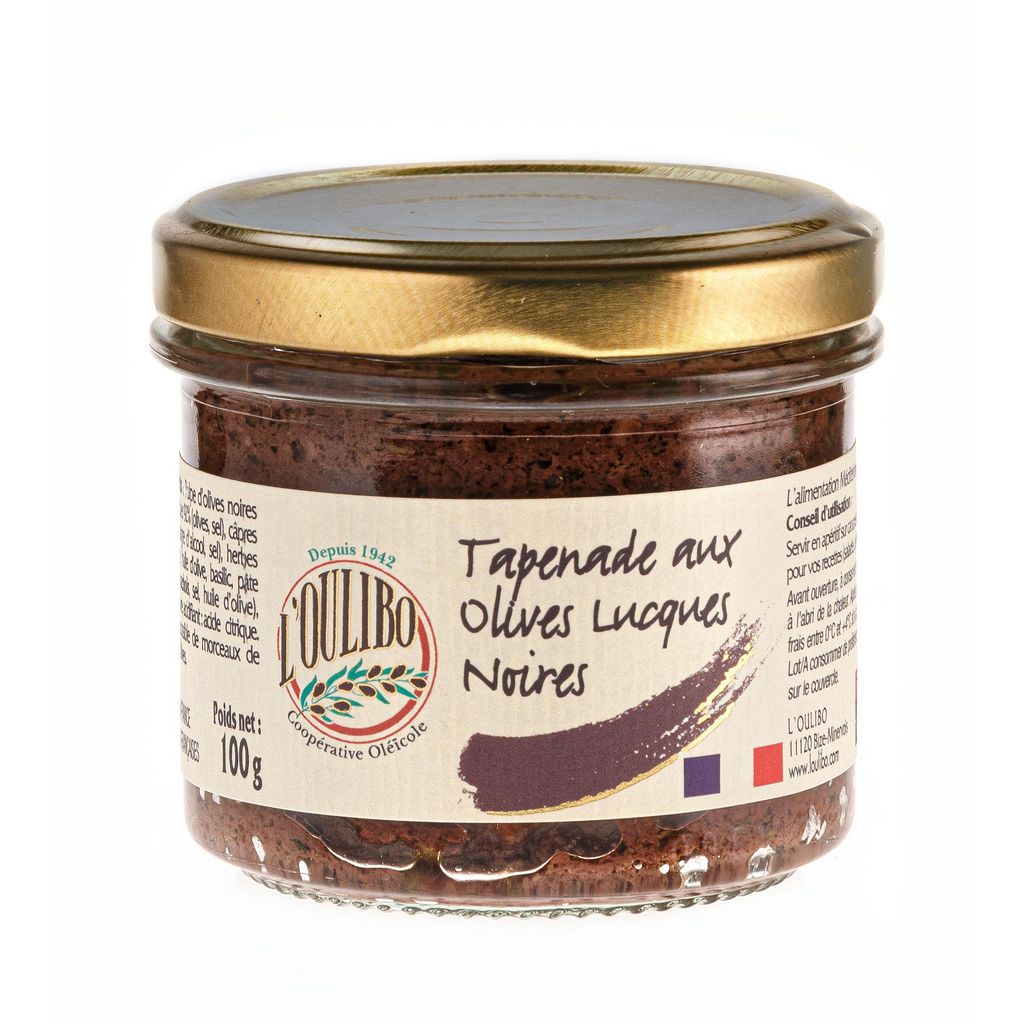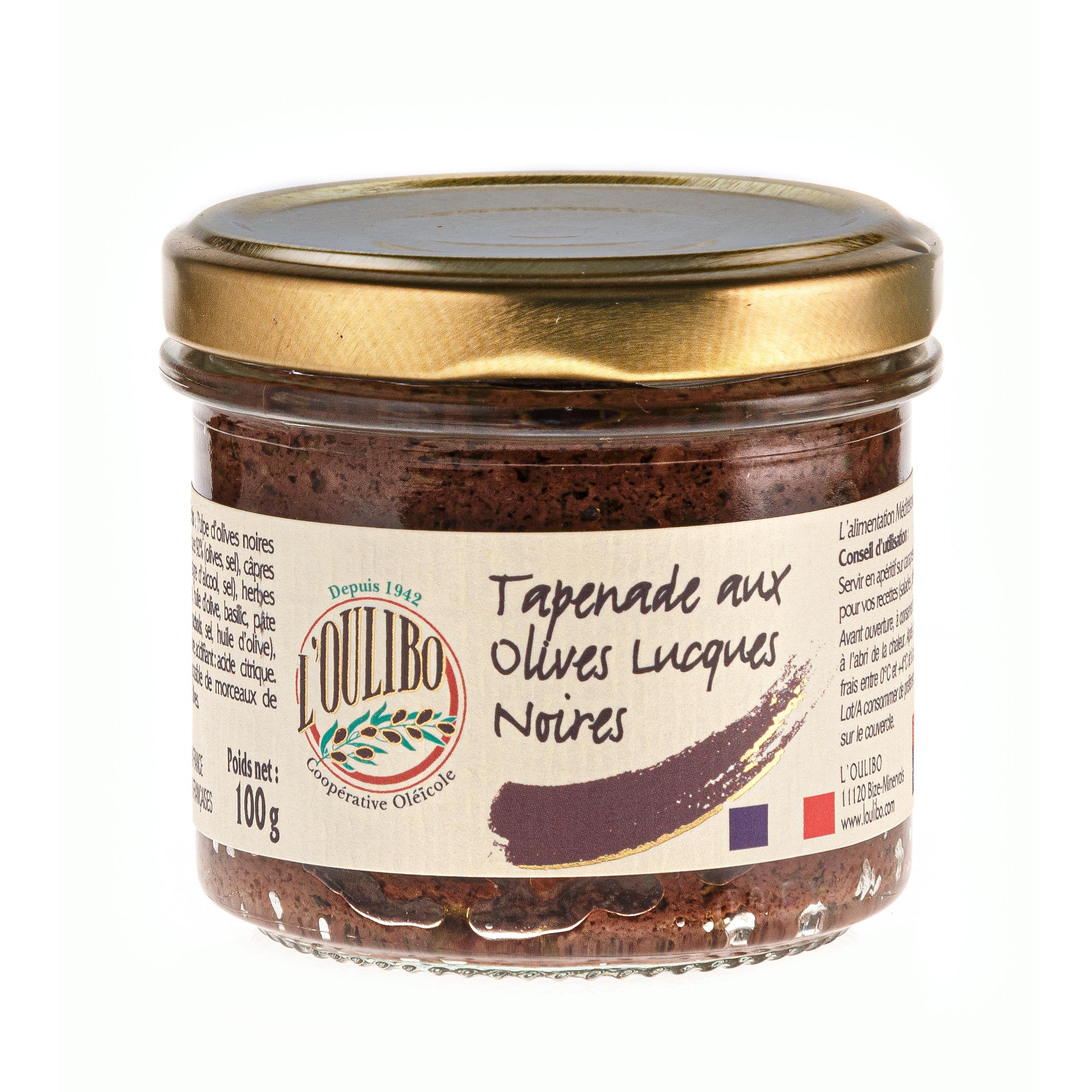 Pulpe d'olives noires variété Lucques 92% (olives, sel), câpres (câpres, vinaigre d'alcool, sel), herbes de Provence, huile d'olive, basilic, pâte d'anchois (anchois, sel, huile d'olive, Cognac, poivre, acidifiant : acide citrique.
