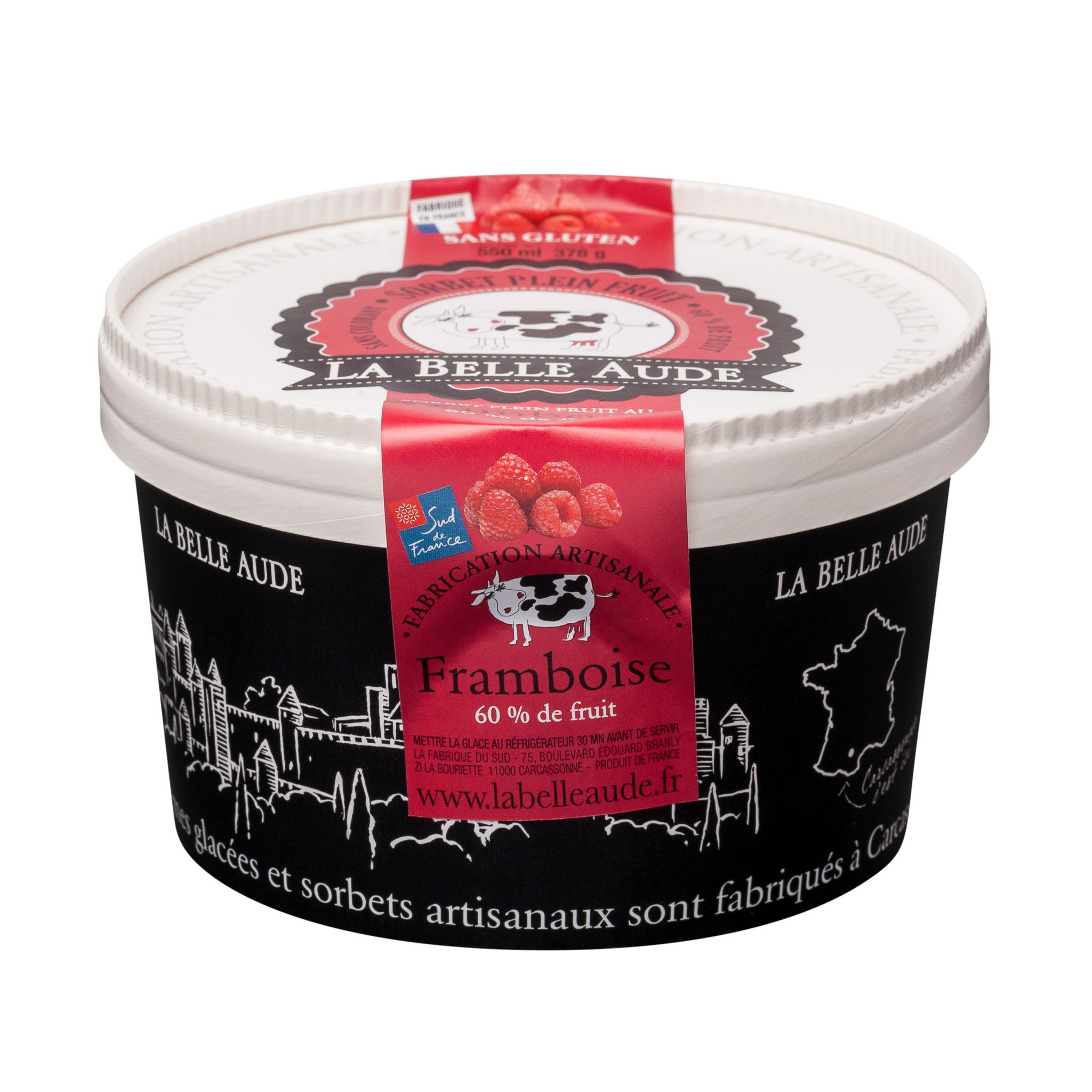 Sorbet artisanale haut de gamme plein fruit à la framboise avec 60% de fruit