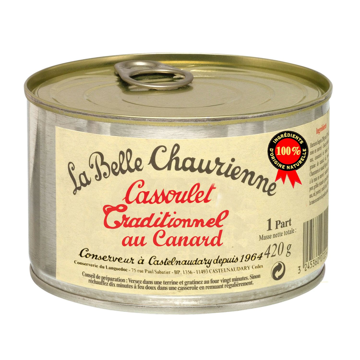 Haricots lingots 200g net (35% à la mise en oeuvre) - Sauce cuisinée : eau, concentré de tomate, sel, graisse de canard, ail, poivre. Charcuterie et viande 90g net (32% à la mise en oeuvre) : viande de canard (20% à la mise en oeuvre du poids net total), saucisse de Toulouse grillée (viande et gras de porc, eau, boyau naturel de porc, sel, poivre).