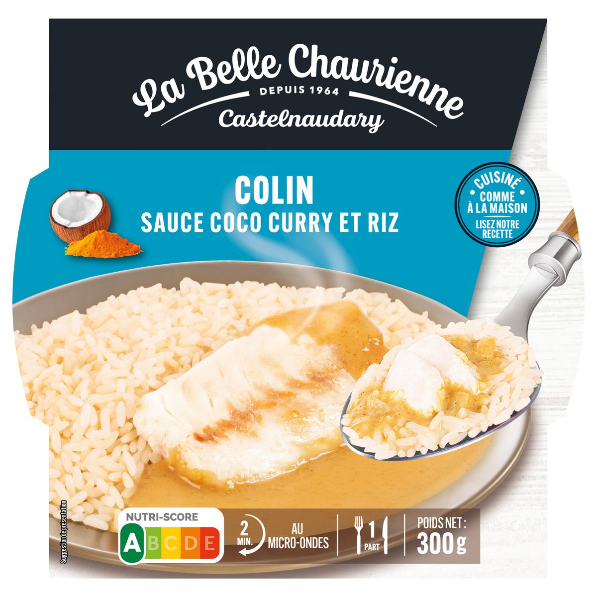 Riz précuit 41% - Dos de colin* 25% (POISSON) - Eau - Oignons - Lait de noix de coco 3,2% - Farine de BLE - Sel - Huile de colza - Pulpe d'ail : ail réhydraté, sel - Curry moulu 0,32% (contient de la MOUTARDE) - Poivre. (% exprimés au moment de leur mise en oeuvre).