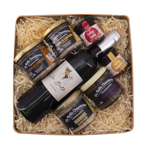 Corbeille gourmande avec terrines et vin rouge