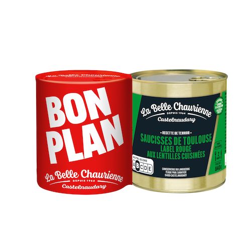 sauce cuisinée : eau, graisse de canard, concentré de tomate, sel, ail, poivre - saucisses de Toulouse Label Rouge grillées 26% : viande et gras de porc, eau, boyau naturel de porc, sel, poivre - Lentilles vertes du Berry Label Rouge 19% - Carottes - Oignons grelots - Traces de GLUTEN - * viandes Label Rouge origine France