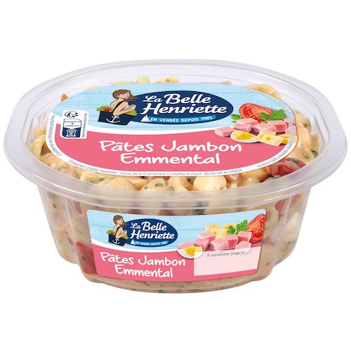 Ingrédients : Ingrédients : Pâtes cuites 24% (eau, semoule de BLE, blanc d'ŒUF en poudre), jambon cuit standard 17% (jambon de porc (Origine : UE), eau, sel, sirop de glucose, exhausteur de goût : E621, stabilisants : E450, E451, dextrose, sucre, gélifiants : E407, E410, gélatine, arôme naturel, conservateur : E250, antioxydant : E316), légumes (tomates 10%, poivrons), huile de colza, eau, tomato ketchup (tomates, sucre, vinaigre d'alcool, amidon transformé, sel, arôme naturel), EMMENTAL 6%, ŒUFS durs 4,1%, vinaigre d'alcool, persil, épices, moutarde (eau, graine de MOUTARDE, vinaigre d'alcool, sel), jaune d'ŒUF en poudre, sel, sirop de glucose, amidon transformé, épaississant : E415, conservateur : E202.