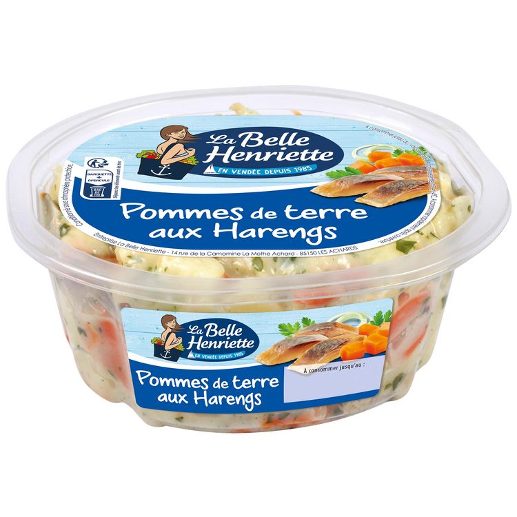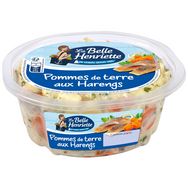 Ingrédients : pommes de terre 54%, harengs fumés 12% (HARENGS, sel), eau, carottes cuites 6,6%, oignons 6,6%, huile de colza, jus de citron à base de concentré, persil, poivre, vinaigre d'alcool, moutarde (eau, graines de MOUTARDE, vinaigre d'alcool, sel), sel, amidon transformé, épaississant : gomme xanthane, conservateur : sorbate de potassium.