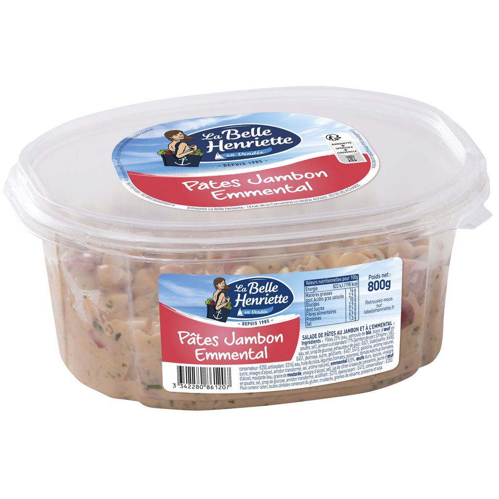 Ingrédients : Ingrédients : Pâtes cuites 24% (eau, semoule de BLÉ, blanc d'ŒUF en poudre), jambon cuit standard 17% (jambon de porc (Origine : UE), eau, sel, sirop de glucose, exhausteur de goût : E621, stabilisants : E450, E451, dextrose, sucre, gélifiants : E407, E410, gélatine, arôme naturel, conservateur : E250, antioxydant : E316), légumes (tomates, poivrons), huile de colza, eau, tomato ketchup (tomates, sucre, vinaigre d'alcool, amidon transformé, sel, arôme naturel), EMMENTAL 6%, ŒUFS durs, vinaigre d'alcool, épices, moutarde (eau, graine de MOUTARDE, vinaigre d'alcool, sel), jaune d'ŒUF en poudre, sel, sirop de glucose, amidon transformé, épaississant : E415, conservateur : E202.