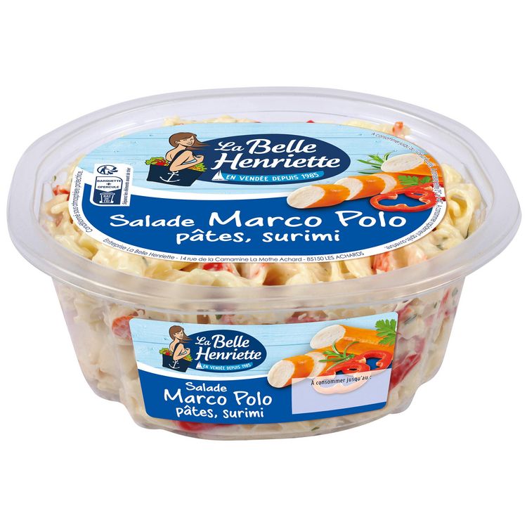 Ingrédients : Ingrédients : pâtes cuites 37% (eau, semoule de BLE, blanc d'ŒUF en poudre, sel), surimi 23% (eau, chair de POISSON, amidon (BLE), blanc d'ŒUF, huile de colza, sucre, sel, arôme naturel (CRUSTACE), colorant : extrait de paprika), eau, huile de colza, poivrons 8,8%, jus de citron à base de concentré, persil, estragon, poivre, vinaigre d'alcool, moutarde (eau, graines de MOUTARDE, vinaigre d'alcool, sel), jaune d'ŒUF en poudre, sel, sirop de glucose, amidon transformé, épaississants : gomme xanthane, conservateur : sorbate de potassium.