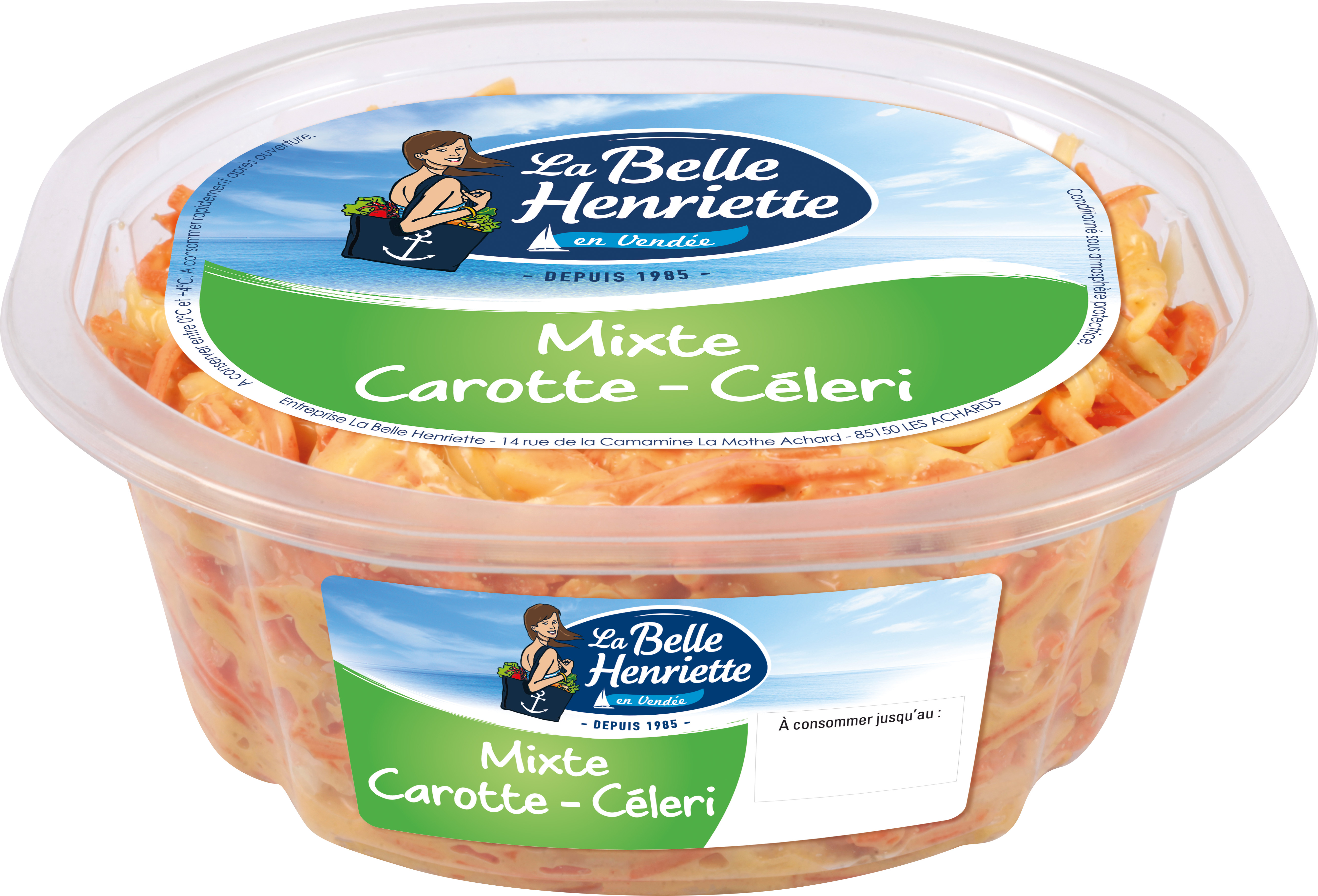 Ingrédients : Ingrédients : carottes 34%, CELERI 34%, huile de colza, eau, vinaigre d'alcool, poivre, moutarde (eau, graine de MOUTARDE, vinaigre d'alcool, sel), jaune d'ŒUF en poudre, sel, sirop de glucose, amidon transformé, épaississant : gomme xanthane, conservateur : sorbate de potassium.
