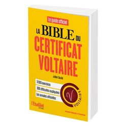 Le Certificat Voltaire est reconnu aujourd'hui par des milliers d'écoles, universités et entreprises. Mentionner votre score au Certificat Voltaire, dans un dossier de candidature ou un CV, atteste votre niveau de maîtrise de la langue française et de ses difficultés. C'est un véritable plus pour vous ! Dans cet ouvrage de référence, Julien Soulié a réuni tous les outils pour optimiser votre préparation et décrocher le meilleur score possible. La Bible du Certificat Voltaire, ce sont : 3 000 exercices pour vous entraîner et maîtriser toutes les difficultés et les pièges de la langue française , 300 difficultés expliquées clairement pour viser le zéro faute , des annales officielles vous permettant de vous tester dans les conditions réelles , des bilans et évaluations à chaque étape de votre préparation. La Bible du Certificat Voltaire est l'ouvrage indispensable pour progresser quel que soit votre niveau !