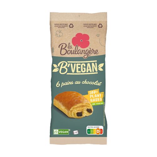 6 PAINS AU CHOCOLAT VEGAN Les Pains au Chocolat Vegan La Boulangère, 100% végétal et 100% plaisir ! Dans ces savoureux Pains au Chocolat Vegan nous avons supprimé les ingrédients d'origine animale : beurre, lait et œuf tout en conservant la gourmandise de ce produit grâce à notre savoir-faire et des ingrédients de qualité : farine de blé français, matière grasse et huile végétales, le tout associé au bon goût de chocolat. Nos produits sont certifiés par EVE VEGAN, organisme indépendant qui respecte un cahier des charges strict en lien avec les principes essentiels du véganisme.