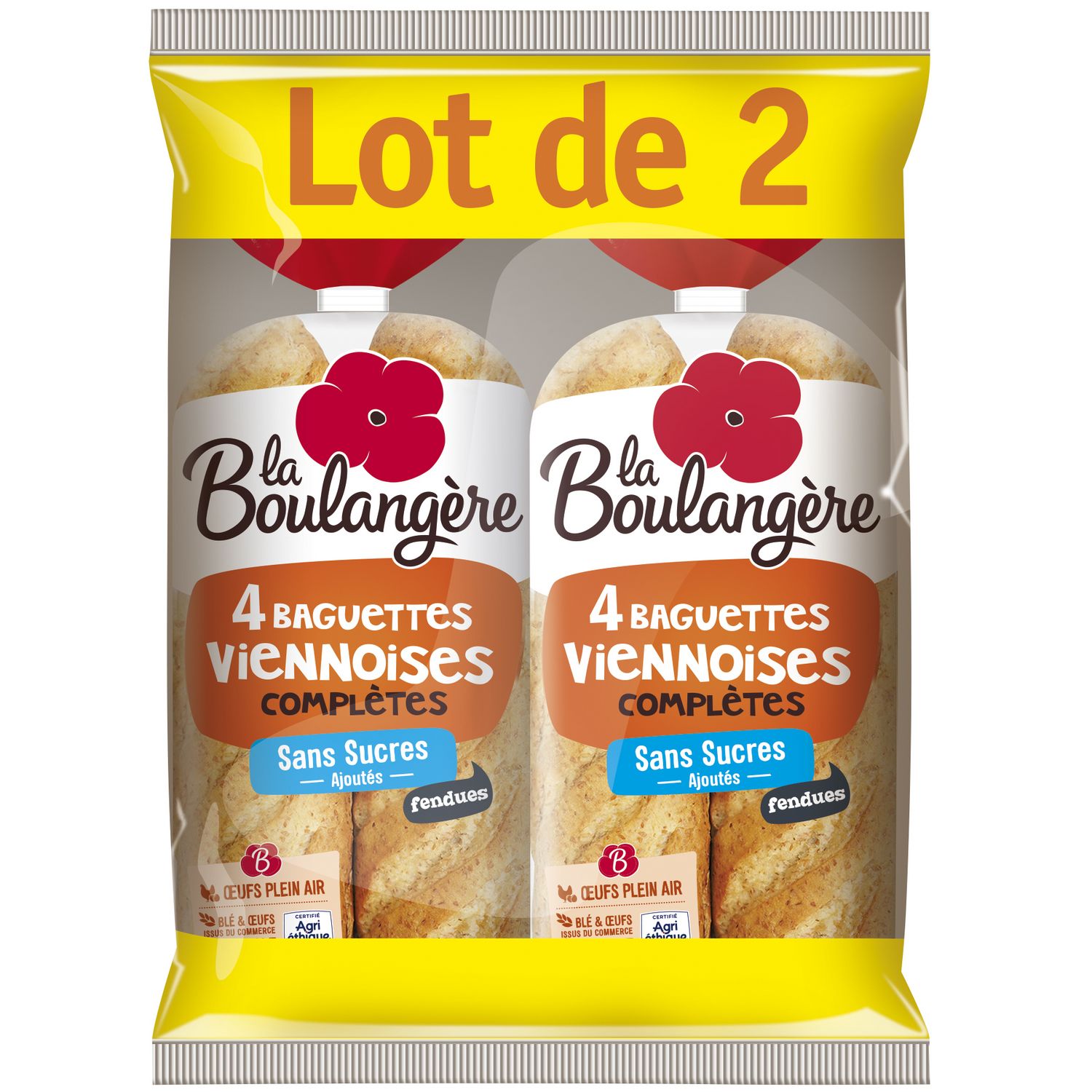 Les Baguettes Viennoises complètes sans sucres ajoutés La Boulangère sont gourmandes et fondantes : elles associent le plaisir de la recette viennoise au bon goût de pain complet. Leur recette est élaborée avec de la farine de blé et des œufs de plein air issus du commerce équitable français. Elles sont idéales en tartines pour le petit-déjeuner ou en sandwich pour le déjeuner, grâce à leur format en long déjà fendu. Les Baguettes Viennoises La Boulangère, ultra pratiques pour le quotidien des familles.