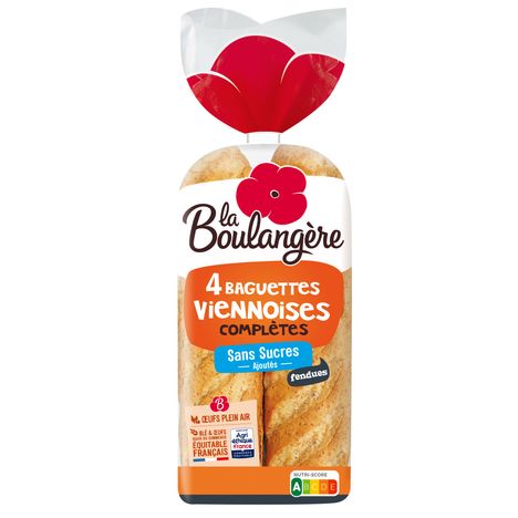 Les Baguettes Viennoises complètes La Boulangère sont gourmandes et fondantes : elles associent le plaisir de la recette viennoise au bon goût de pain complet. Leur recette est élaborée avec de la farine de blé et des oeufs de plein air issus du commerce équitable français. Elles sont idéales en tartines pour le petit-déjeuner ou en sandwich pour le déjeuner, grâce à leur format en long déjà fendu. Les Baguettes Viennoises La Boulangère, ultra pratiques pour le quotidien des familles.