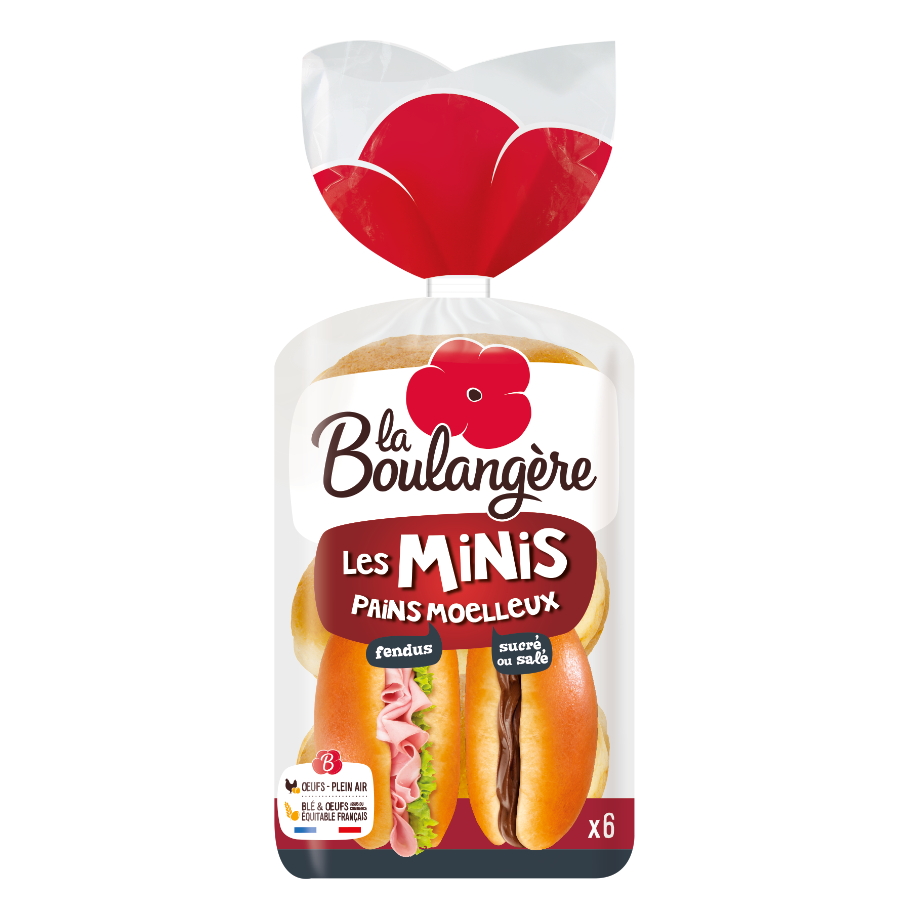 6 PETITS PAINS BRIOCHES FENDUS Les Minis Pains Moelleux La Boulangère sont des petits pains nature à la texture briochée, élaborés avec de la farine de blé issu du commerce équitable français. Ils peuvent se consommer avec une garniture sucrée pour le petit-déjeuner et le goûter comme avec une garniture salée, en encas dans la journée. Pratiques au quotidien, ils sont déjà fendus pour plus de simplicité et de rapidité d'utilisation.