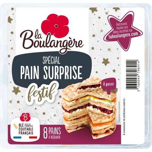 Le spécial Pain Surprise La Boulangère est spécialement conçu pour réaliser un apéritif festif. Cette recette moelleuse est élaborée avec de la farine de blé issu du commerce équitable français. Ces 8 pains suédois ronds s'accompagnent de tout type de garnitures, sucrées ou salées : saumon, foie gras, crudités, fromage frais...Ils se superposent les uns aux autres afin de créer un pain surprise à partager à l'occasion des fêtes de fin d'année.