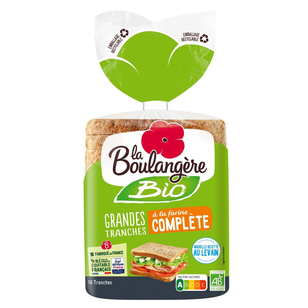 Le pain de mie grandes tranches Bio à la farine complète La Boulangère est élaboré avec de la farine de blé bio issu du commerce équitable français. Ses tranches généreuses au goût de pain complet en font le pain de mie idéal pour les tartines du petit-déjeuner, mais il peut aussi se consommer en sandwich pour varier les plaisirs.