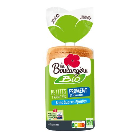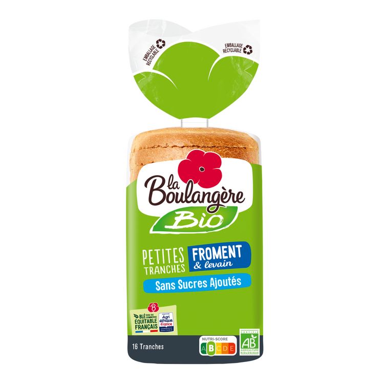 PAIN DE MIE TRANCHÉ ISSU DE L'AGRICULTURE BIOLOGIQUE Le pain de mie petites tranches Bio à la farine de froment La Boulangère est élaboré avec de la farine de froment bio issu du commerce équitable français. Ses tranches moelleuses sont idéales pour une utilisation en croque-monsieur mais peuvent aussi être consommées au petit-déjeuner, ou en sandwich.