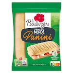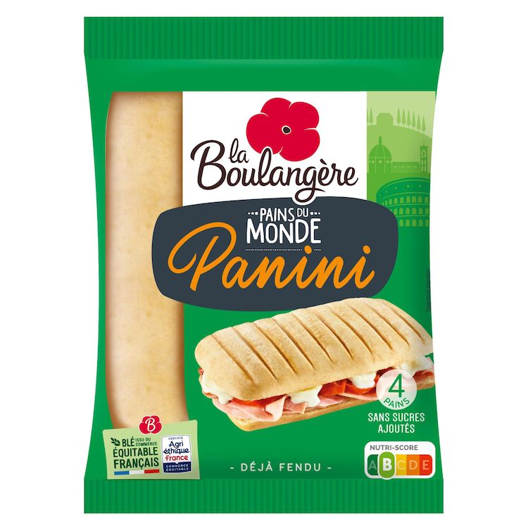 Le pain Panini La Boulangère est idéal pour préparer un sandwich chaud à manger sur le pouce. Ce pain à l'huile d'olive est élaboré avec de la farine de blé issu du commerce équitable français. Déjà fendu, ce pain est prêt à garnir et à réchauffer en 2 minutes au grill pour un pain croustillant et moelleux à la fois. Les Pains du Monde La Boulangère invitent au voyage avec ce pain Panini inspiré de l'Italie.