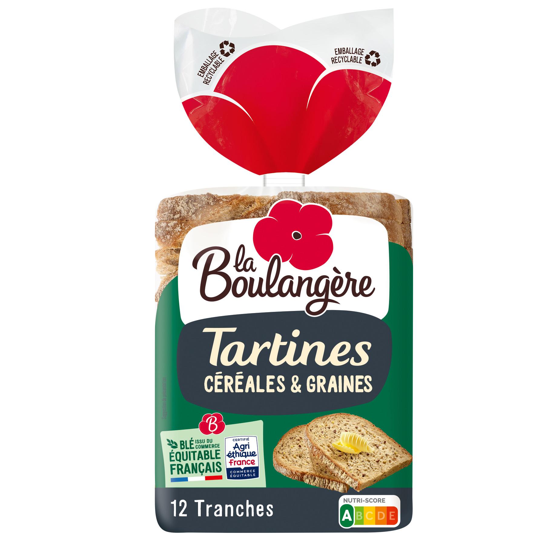 Les Tartines Céréales La Boulangère se caractérisent par leur croûte brune et farinée ainsi que par leur mie fondante et alvéolée. Cette recette élaborée avec de la farine de blé issu du commerce équitable français associe le bon goût de pain de campagne au croquant des graines de tournesol, lin, millet et pavot. Ces tartines peuvent se consommer toastées au petit-déjeuner comme en accompagnement des repas.
