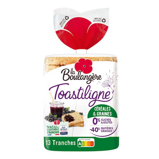 Le pain de mie Toastiligne aux céréales & graines La Boulangère propose une recette sans superflus grâce à sa composition sans sucres ajoutés* et avec 40% de matières grasses en moins**. Source de fibres, sa recette est élaborée avec de la farine de blé issu du commerce équitable français qui s'associe au croquant des graines de tournesol, lin, millet, pavot et sarrasin. Polyvalent, il peut se consommer en sucré au petit-déjeuner comme en sandwich salé pour le déjeuner et le dîner. Le pain de mie Toastiligne aux céréales & graines La Boulangère : l'allié des repas équilibrés. *Contient uniquement les sucres naturellement présents dans les ingrédients de base tels que la farine ** 40% de matières grasses en moins que la moyenne des pains de mie grandes tranches nature à marque nationale