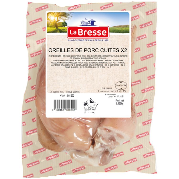 Oreilles de porc, eau, sel, dextrose, conservateurs : nitrite de sodium, érythorbate de sodium.