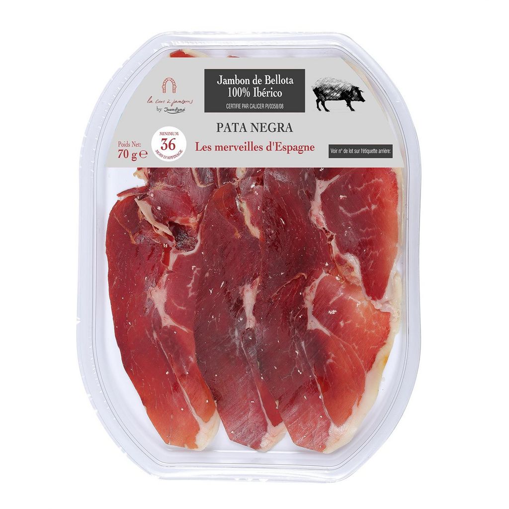 Jamon de bellota 100% raza ibérica, Jambon de bellota 100% race ibérique PATA NEGRA, en tranches, 36 mois d'affinage minimum