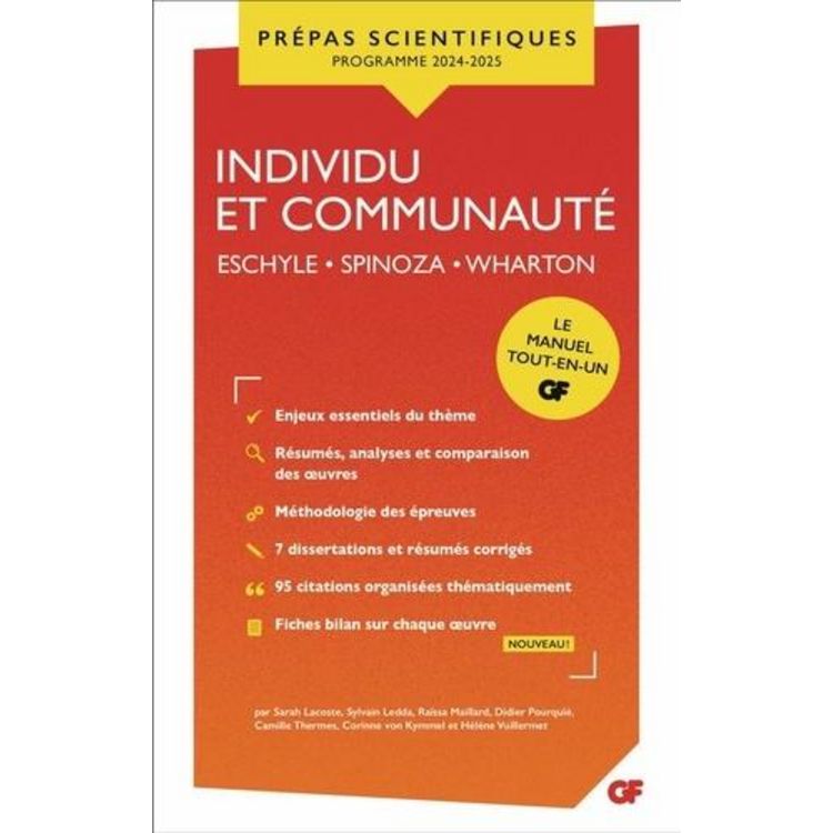 Individu et communeauté ESCHYLE, Les Sept contre Thèbes et Les Suppliantes SPINOZA, Traité théologico-politique (préface et chapitres XVI à XX) WHARTON, Le Temps de l'innocence Le manuel tout-en-un indispensable pour réussir l'épreuve de français-philosophie des concours. - Une introduction générale sur le thème, sa place dans l'histoire de la pensée et ses problématiques - Une étude détaillée sur chacune des oeuvres au programme, avec résumé, structure, encadrés thématiques et analyse du texte à partir du thème - Une réflexion synthétique et problématisée sur le thème à partir de l'étude des oeuvres - Des fiches bilan sur chaque oeuvre - Une méthodologie de la dissertation et du résumé - Des conseils pour travailler en autonomie et rédiger une bonne copie - Des dissertations et des résumés entièrement corrigés - Un répertoire de citations regroupées par thèmes et commentées.