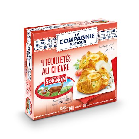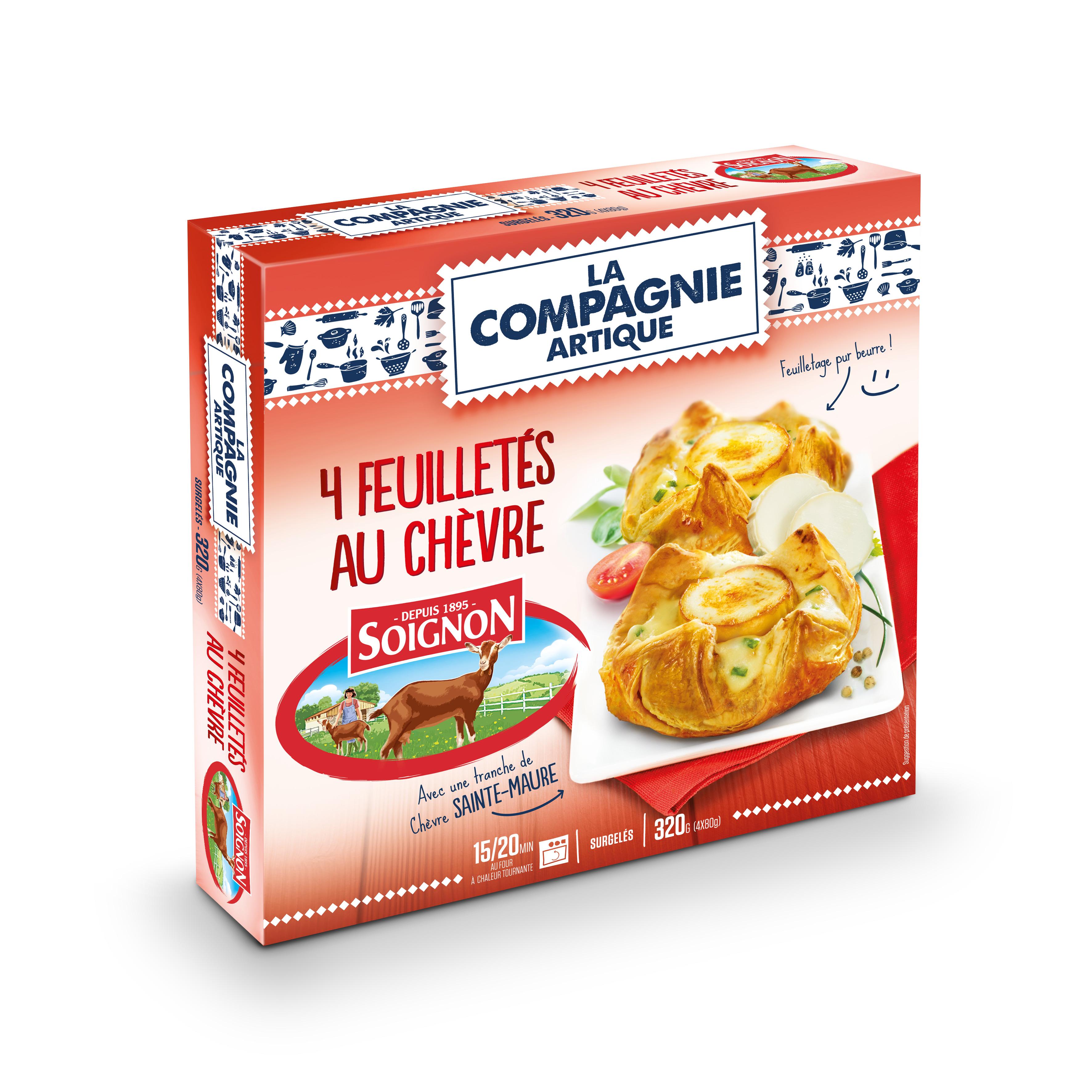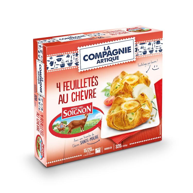 Pâte feuilletée dorée 50% (farine de blé (gluten (blé)), eau, beurre (lait), sel, protéines de blé (gluten (blé)), enzyme : protéase, œuf entier), eau, fromage de chèvre Soignon 18,7% (lait de chèvre), crème fraîche fluide légère (lait), lait entier en poudre, amidon de maïs, ciboulette, farine de blé (gluten (blé)), lait écrémé en poudre, piment d'Espelette, muscade, poivre blanc. Fromage de chèvre Sainte Maure fabriqué en France à partie de lairt origine UE