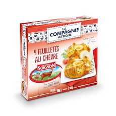 Pâte feuilletée crue garnie d’une préparation à base de fromage de chèvre Sainte Maure, surgelée.