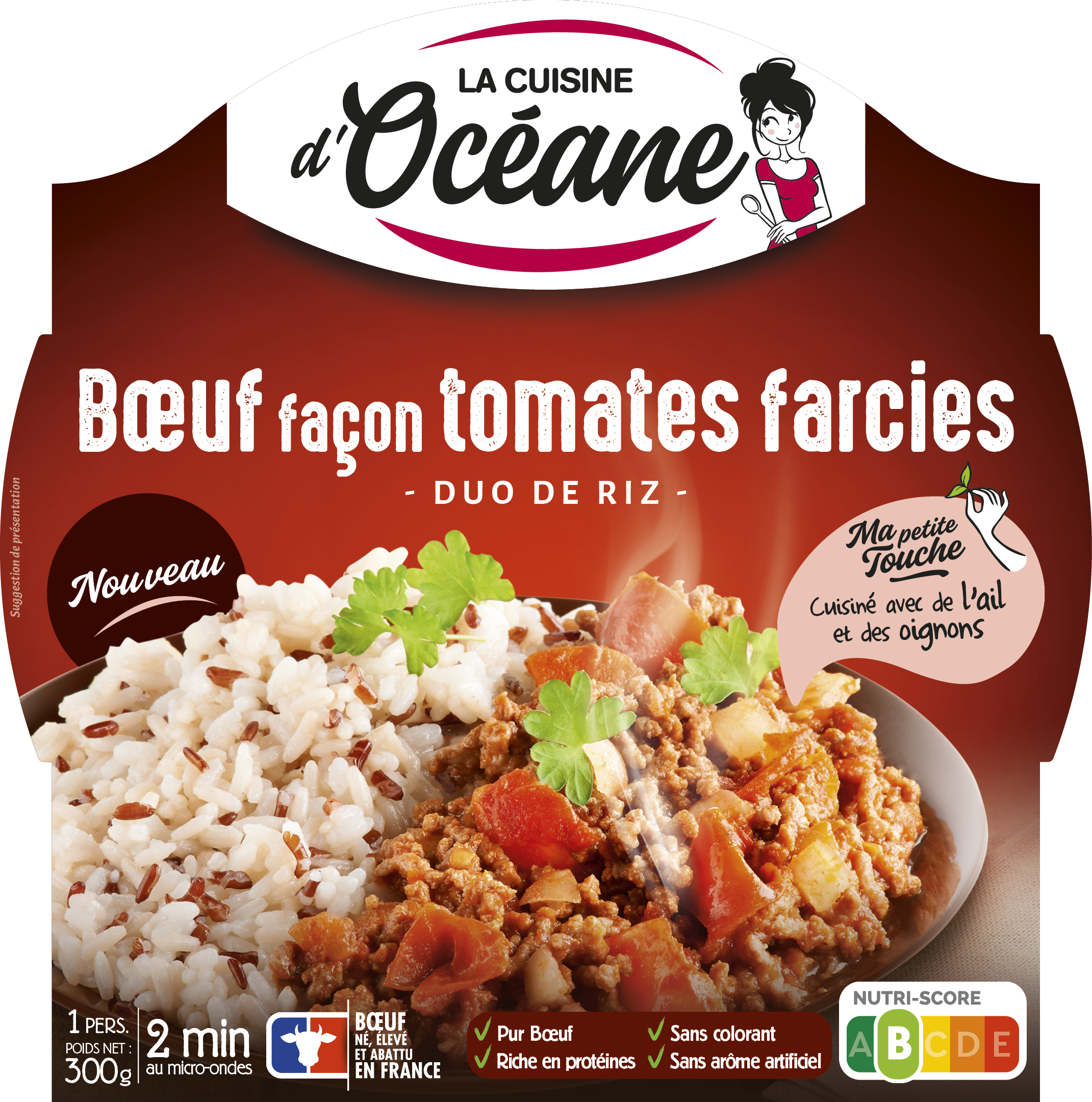 Océane a sélectionné pour vous un bœuf haché français cuisiné avec des herbes, de l'ail et des tomates concassées, façon tomate farcie. Accompagné d'un duo de riz blanc et rouge, pour un repas en toute simplicité.