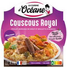 Pour vous concocter ce généreux couscous royal, Océane a sélectionné des merguez de bœuf relevées, une boulette d'agneau savoureuse et du poulet fondant. Les courgettes, carottes, pois chiches et navets sont cuisinés dans un bouillon savoureux et servis avec une semoule épicée.