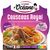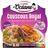 Ingrédients : Semoule de BLE dur précuite 31% (eau, semoule de BLE dur de qualité supérieure, huile de colza, sel), eau, poulet 11% (viande de poulet ( Origine : UE), sel), merguez 10% (viande de boeuf, gras de boeuf, épices et plantes aromatiques, boulette d'agneau 6,6% (viande d'Agneau ( origine : France), protéine de SOJA réhydratées, sel, arômes, plantes aromatique), carottes, courgettes, poivrons rouges et verts 6,6%, oignons, pois chiche, concentré de tomate, navet, farine de BLE, cumin, coriandre, sel, curcuma, piment fort, cannelle. Traces éventuelles de poissons, moutarde et d'oeufs.
