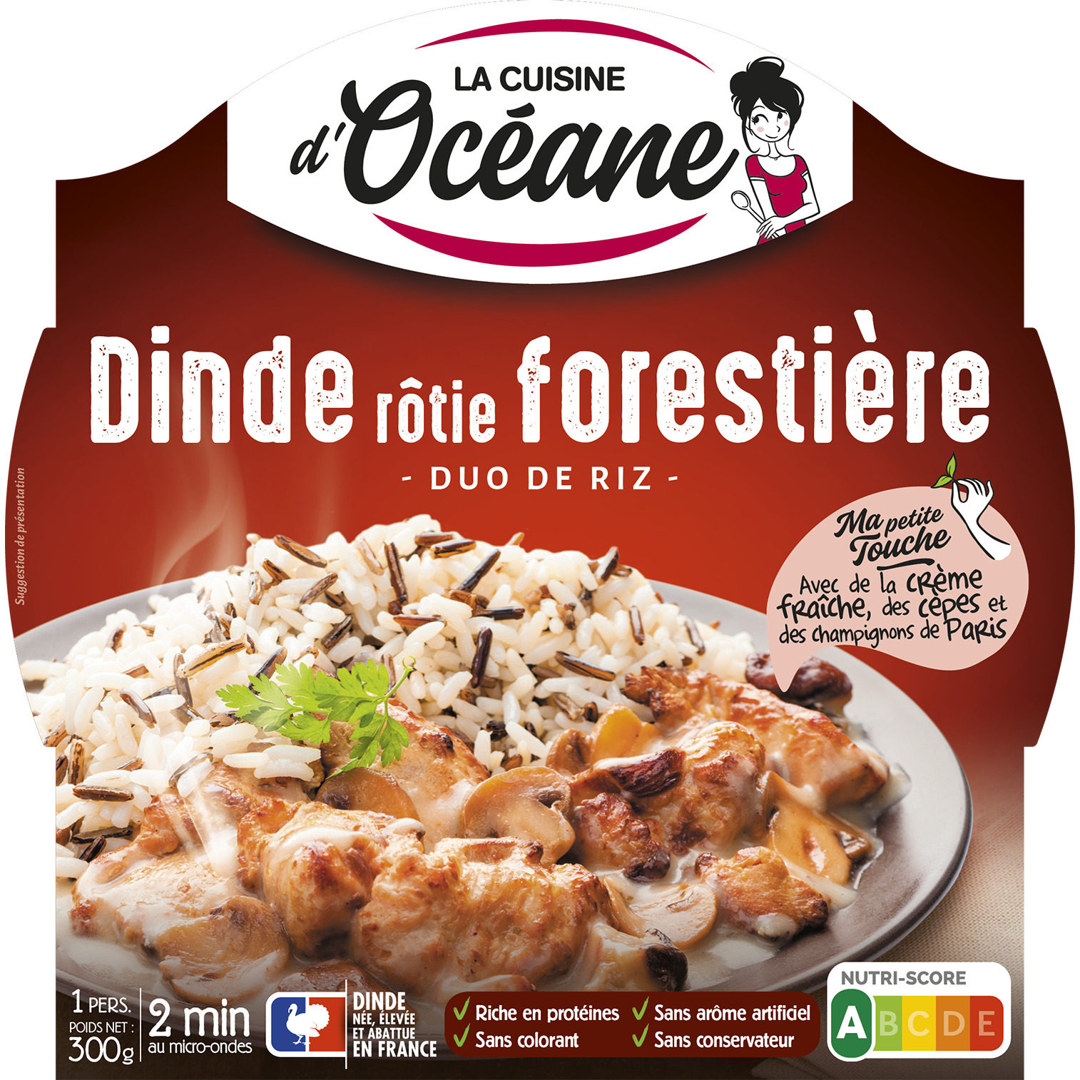 Océane a sélectionné de délicieux morceaux de dinde rôtie cuisinés avec de la crème fraîche, des cèpes et des champignons de Paris. Pour une assiette gourmande et équilibrée, ils sont accompagnés d'un savoureux duo de riz blanc et riz sauvage.