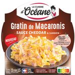 Ingrédients : Eau, sauce au CHEDDAR 20% (cheddar, EAU, lait écrémé, BEURRE, LACTOSERUM, fécule de manioc, sel), MACARONIS19% (eau, semoule de BLE dur, blanc d'OEUF), jambon 17% (jambon de porc (origine france), sel, bouillon de légumes (blette, carotte), ferment), EMMENTAL râpé 6% (LAIT, sel, ferments LACTIQUES), CREME fraîche 4% (LAIT, ferments LACTIQUES), farine de BLE, poudre de LAIT, MOUTARDE forte 0,67% (eau, graines de MOUTARDE, vinaigre d'alcool, sel, acidifiant : acide citrique), concentré de tomate, poivre blanc, muscade, curcuma.