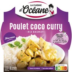 Ingrédients : Riz basmati précuit 40% (eau, riz Basmati, sel, huile de colza), poulet cuit 26% (viande de poulet ( origine: UE), sel), eau, oignons, lait de coco 5%, farine de BLE, huile de colza, mélange coco curry 0,7% (curry 0,4% (curcuma, coriandre, fenugrec, cumin, poivre, piment, fenouil), dextrose de blé, paprika, lait de coco (maltodextrine de tapioca ou de maïs, protéines de LAIT, arôme naturel), sucre, jus de citron, oignon déshydraté, coriandre0,4%, sel, cumin 0,06%, curry 0,02% (contient MOUTARDE), gingembre 0,01%. Traces de POISSONS et d'OEUF