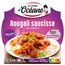 Ingrédients : Riz précuit 36,6% (riz blanc, eau, sel, huile de colza, curcuma), saucisse fumée 26,6% (viande de porc (origine : France), sel, sirop de glucose, poivre, ail, extraits d'épices), tomates 10 %, oignons, eau, pulpe de tomates (tomates, jus de tomates), concentré de tomates, huile de colza, oignons déshydratés, purée de piment (piment vert 0,2%, huile de tournesol, gingembre, sel, vinaigre d'alcool, ail, citron vert), miel, farine de BLE, ail, purée de gingembre (gingembre, jus de citron, sel, vinaigre d'alcool), curcuma, thym, sel, cumin, coriandre. Préparé dans un atelier utilisant du poisson, de la moutarde, du lait et de l'oeuf.