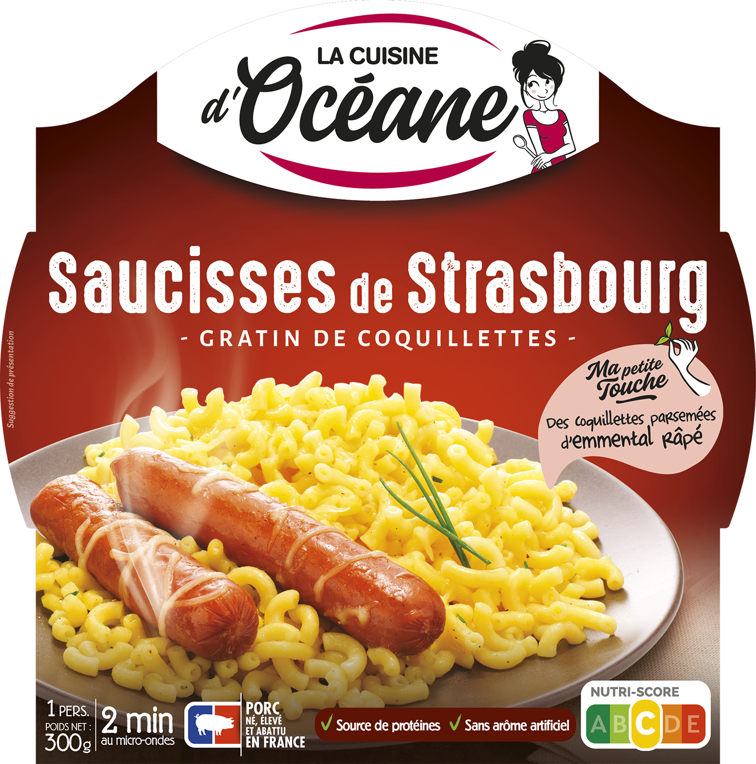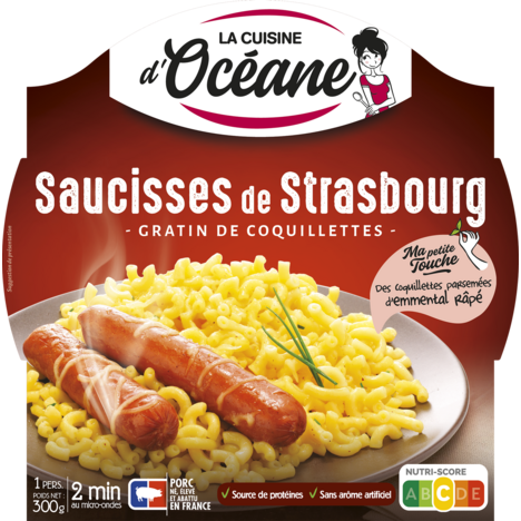 Océane vous propose un plat simple et bon qui plaira aux petits et grands gourmands. Dégustez deux saucisses de Strasbourg issues de porcs nés, élevés et abattus en France. Pour une assiette savoureuse et équilibrée elles sont accompagnées de coquillettes cuisinées avec de la crème fraîche, de l'emmental râpé et une pointe de ciboulette.