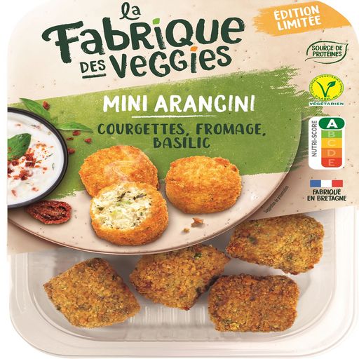 Ingrédients : Riz rond cuit 27%, courgette(1) 20%, chapelure 11% (farine de blé, levure), oignon, huiles végétales (colza et tournesol) en proportion variable, fromage(2) végétarien 6,4% (lait), protéine de blé(1) (gluten de blé(1), farine de blé(1)), farine de riz 4,6%, farine de maïs, fibres de chicorée, basilic 2,7%, eau, gluten de blé(1), blanc d'œuf(3) en poudre, ail, sel, extrait d'oignon, poivre, thym.(1)cultivé en France - (2)origine Europe - (3)œufs issus de poules élevées en Europe.Traces éventuelles de soja, lupin, céleri, moutarde et sésame.