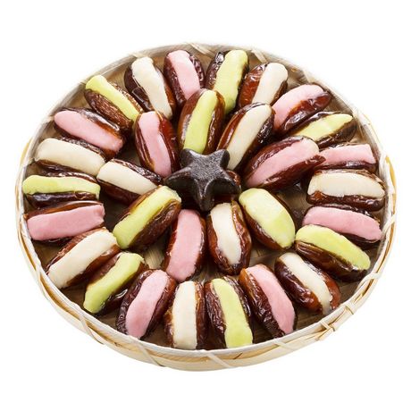 Miam, que demander de plus que cet assortiment de dattes fourrées ultra gourmand rose, blanc et vert ?! Et pour couronner le tout : une délicieuse boule de pâte d’amande à la noix de coco. Un vrai plaisir à partager… ou à garder pour soi !
