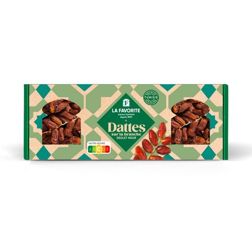 La Favorite vous propose un coffret unique de dattes naturelles branchées. A maturité, les branches des régimes de dattes sont coupées et conditionnées directement dans les grands coffrets La Favorite : nous avons créé ce coffret unique (modèles déposé) qui permet de conserver la branche dans son intégrité et de préserver la qualité du produit.