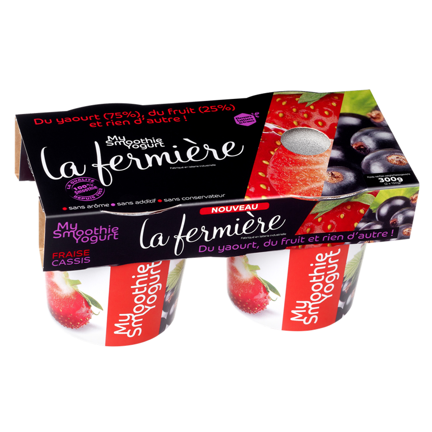 Yaourt brassé au cassis et à la fraise présenté dans un pot bi-matière recyclable. Un tout nouveau concept à mi-chemin entre le smoothie et le yaourt.