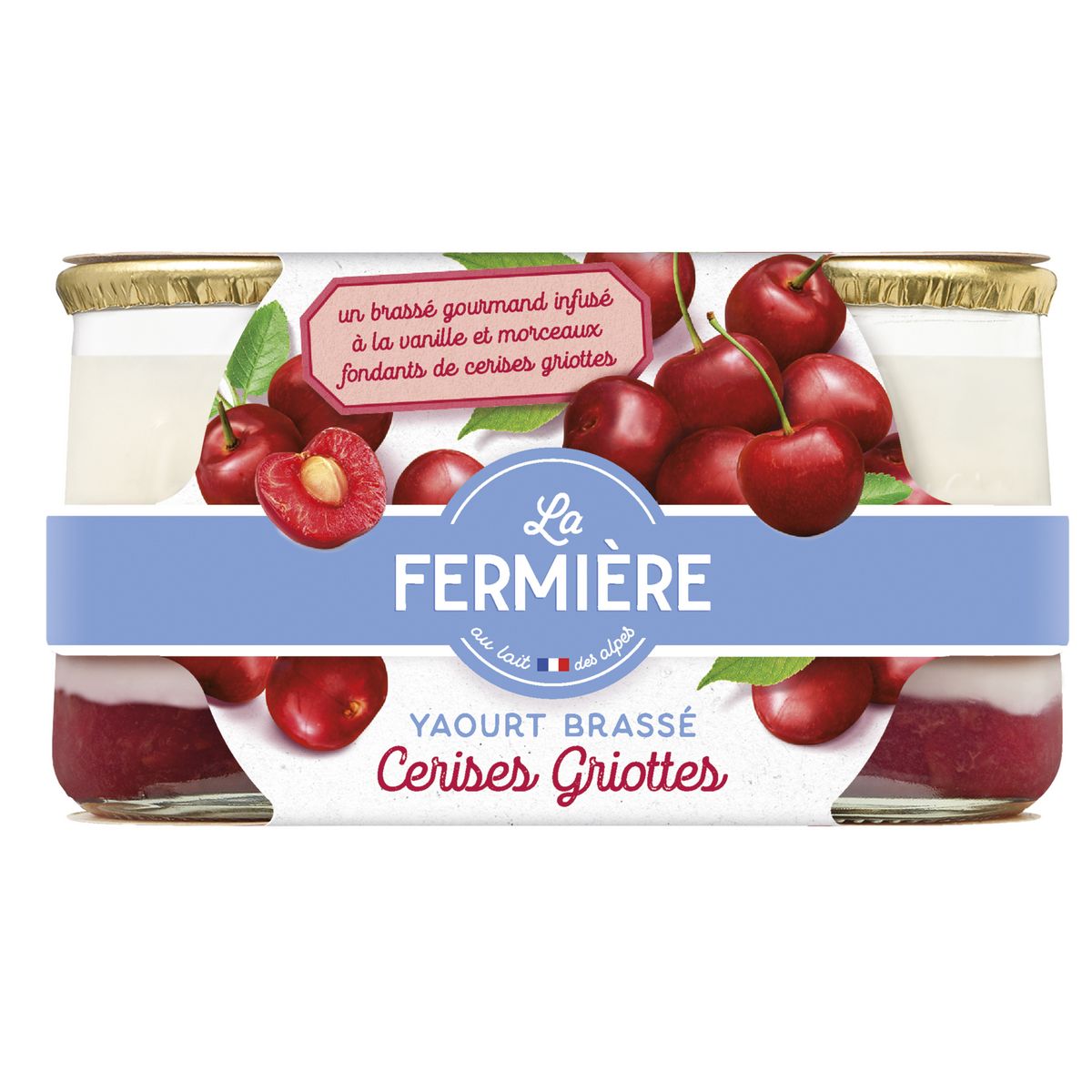 LAIT entier 66%, préparation aromatisée à base de cerise 18,8% (cerise griotte morceaux 50%, sucre, eau, amidon, épaississant : pectines, arômes naturels, conservateur : sorbate de potassium), CRÈME, sucre 1,8%, infusion de gousses de vanille - fève tonka poudre (LAIT), ferments LACTIQUES.