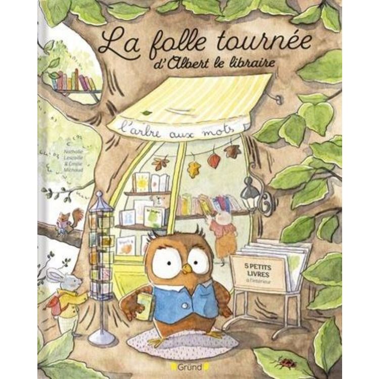 Accompagne Albert le libraire dans sa distribution de livres à travers la forêt ! Dans la librairie d'Albert, il y a des livres plein les branches ! Des gros qu'on dévore ou des petits qu'on picore, rigolos ou intellos, poétiques ou historiques, distrayants ou très savants. Et pour ses clients qui ne peuvent pas se déplacer, Albert leur rend visite dans la forêt pour leur apporter le livre dont ils ont besoin. Mais un jour, alors qu'il termine sa tournée, la pluie et le vent menacent de tout faire envoler... Un album sur le pouvoir des livres et les émotions qu'ils procurent, illustré par Emilie Michaud, avec 5 petits livres à découvrir à l'intérieur du livre, une berceuse, une fable, une histoire, un manuel et un roman.