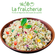 Semoule de blé (GLUTEN), Tomate, Poivron vert, Poivron jaune, Pomme, Oignon, Huile d'olive vierge extra, Citron, Menthe, Sel