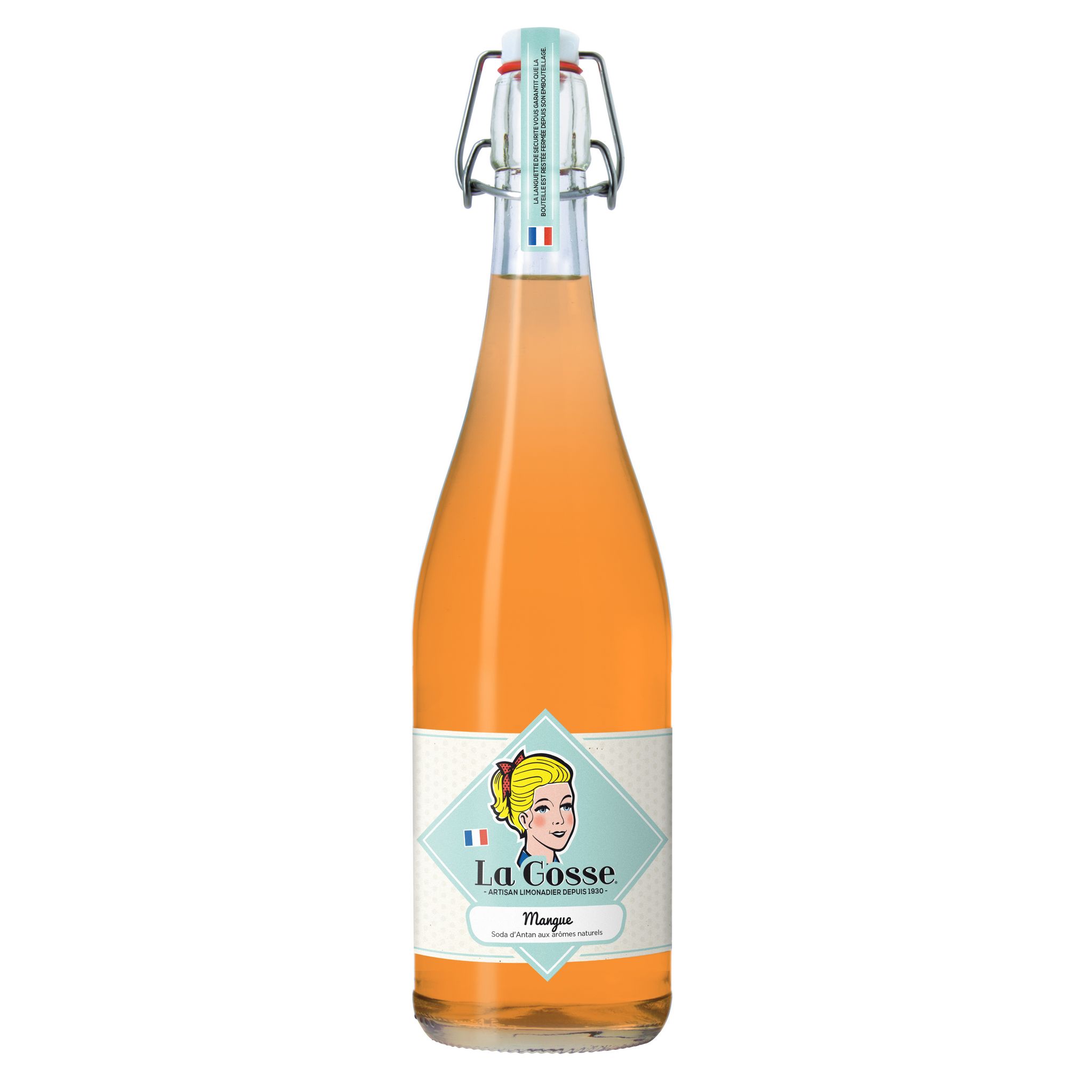 Ingrédients : Eau gazéifiée, sucre, acidifiant : acide citrique, arôme mangue, colorants : E110, E124.