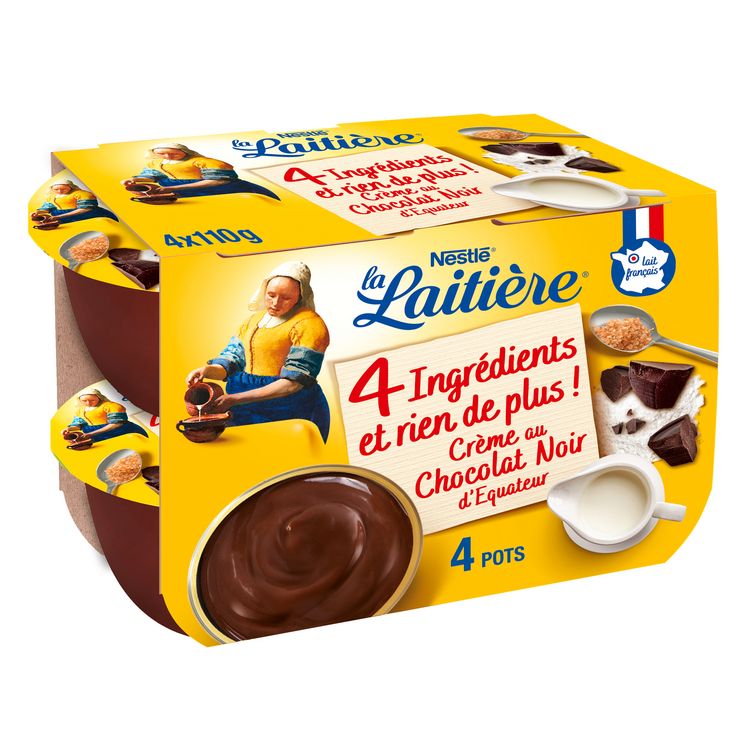 La Laitière a élaborée sa recette de crème dessert en sélectionnant 4 bons ingrédients : du chocolat ?, du bon lait origine France, la juste dose de cassonade, de la farine de tapioca pour l'onctuosité.